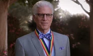 They go back to the party, and get everyone's attention. The partygoers mostly just stare at them, silently, as Eleanor explains that the Good Place is like a never-ending vacation, but vacations are only special because they end. The Soul Squad has set up a new kind of door where when one feels happy and satisfied and complete, and want to leave the Good Place for good, they can just walk through the door and their time in the universe will end, leading to a peaceful rest of indeterminate nature. Michael finishes the speech, telling the residents they led great lives and earned their place here, so they can stay as long as they like, do and see every single thing they want to see and do, and when they're ready, walk through one last door, and be at peace.