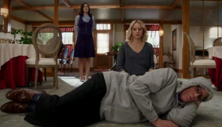 Michael and Eleanor are in the restaurant where the sinkhole opened up, and that night the guest list was limited: Janet has 30 names. But then she adds 66 others who passed through earlier, so Eleanor can say this is no clue at all. Michael says he's giving up, he can't help the people he promised to help, he lays down and hopes the sinkhole will open up and swallow him.